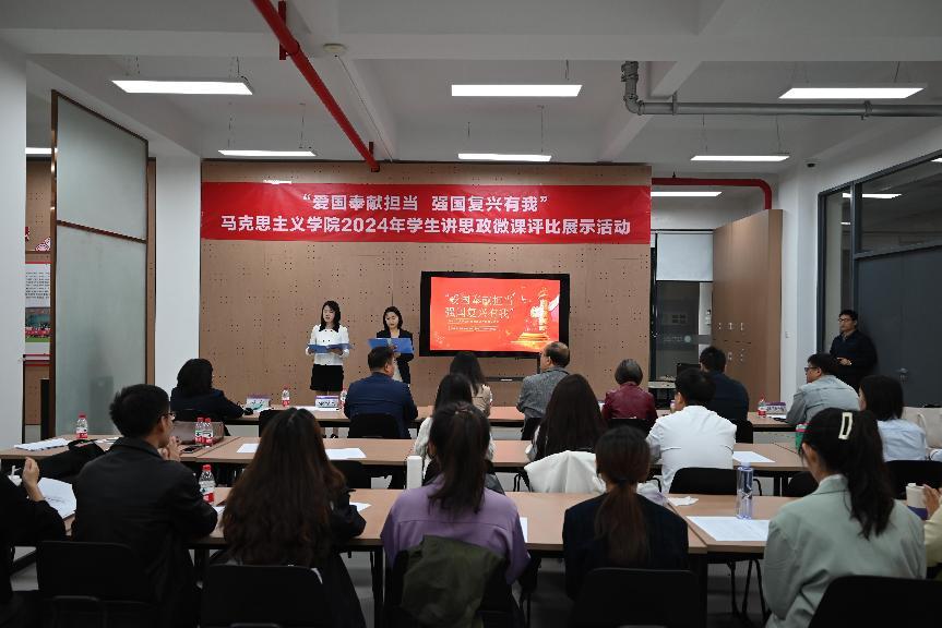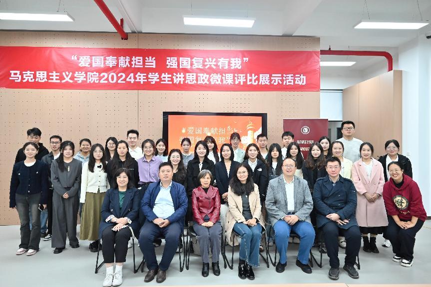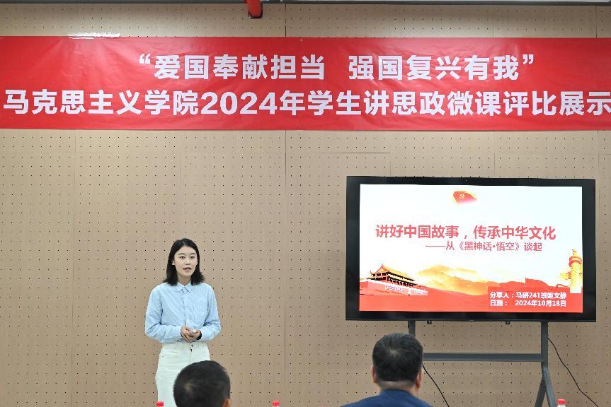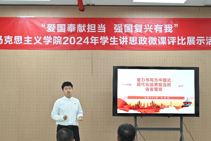 “共产党员的味道”“时光的见证者:七十五载光影里的中国”“为中国式现代化注入‘青春动能’“跨越时空的青春对话”“家书纸短 家国情长”“中国青年 向祖国报到”……同学们紧扣“爱国奉献担当强国复兴有我”主题讲授思政微课,展现马院学子青春风采。